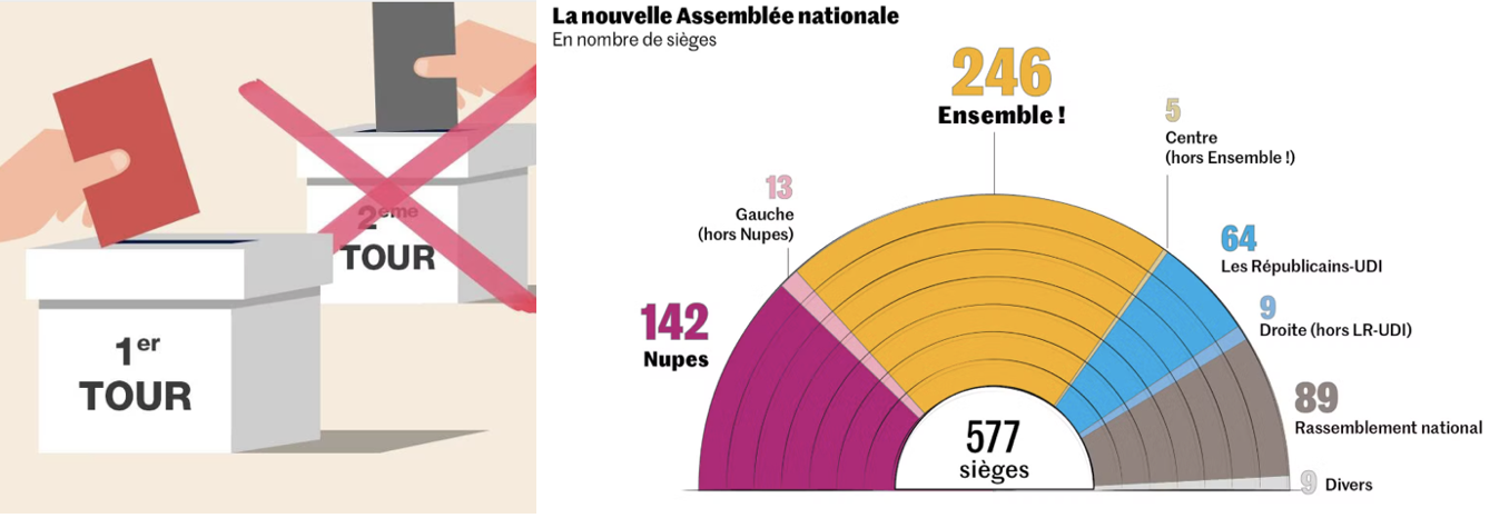 Une élection présidentielle discrète en 2022, marginalisée avec la certitude d’un résultat acquis, élections législatives inclues. Un constat non discutable : le parti présidentiel et ses alliés ne sont pas majoritaires. La répartition dans l’hémicycle dégage un système à 3 blocs relatif de tailles différentes mais avec un taux d’influence équivalent. La stabilité relative n’est qu’apparente. La minorité représentative du pouvoir est bloquée. Elle survit. Les 2 autres corps opposés et minoritaires se maintiennent sans pouvoir agir, sauf en cas de censure.