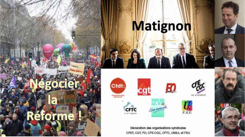 Que dire de la proposition du gouvernement ? Il fluctue en fonction des évènements pour conclure qu’il a été fixé d’avance et que les concertations s’achèveront après la première manifestation du 5 décembre (probablement plus d’un million de citoyens dans la rue, dans tout le pays), prévue depuis 2 mois et qui ne reste pas sans suite avec le rassemblement massif du 17 décembre et une grève qui se poursuit !