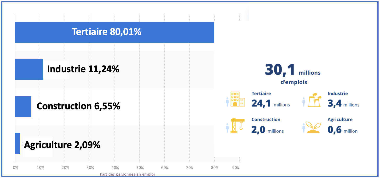 Répartition du nombre de salariés par secteur – source : Statistica & Insee
