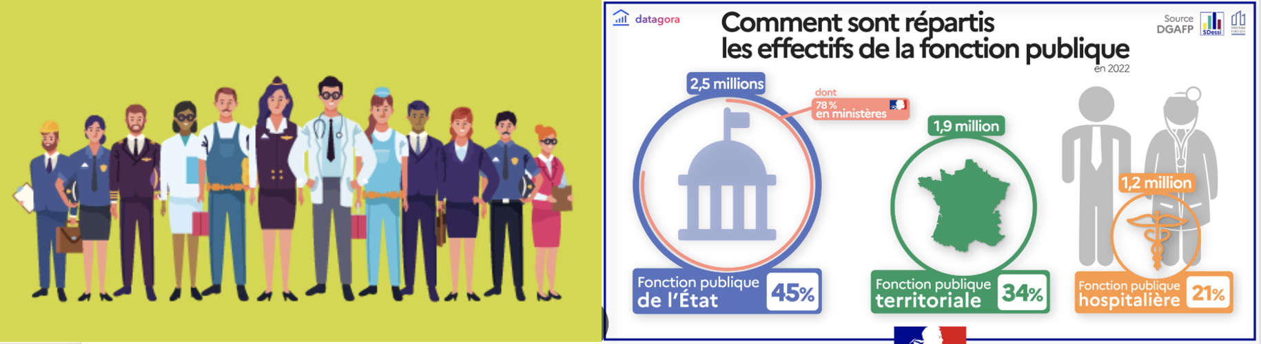 Près de 6 millions de salariés, soit environ 27 % des actifs, travaillent aujourd’hui dans le secteur public. Parmi eux, deux tiers sont fonctionnaires et un tiers sont assimilés, affectés à des secteurs non marchands, sauf quelques cas particuliers. Les 1,3 million de cadres ou équivalents sont classés en catégorie « A », toutes directions confondues. Ils représentent un peu moins d’un quart des salariés de la fonction publique.