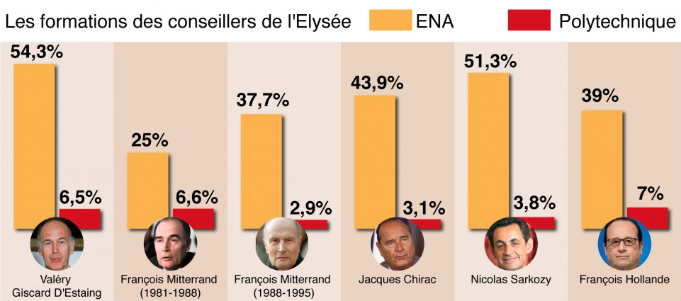 La plupart des conseillers et des collaborateurs, choisis ou imposés, expérimentés ou non, sont en général et majoritairement, anciens élèves de l’Ecole, Nationale d’Administration (ENA). Il est bon de rappeler qu’en fonction de leur classement, les grands corps (Conseil d’État, Inspection générale des finances et Cour des comptes) sont généralement choisis parmi les 12 (ou 15 selon les années) premiers (c’est la botte). Suivent la direction générale du Trésor (4 à 6 postes d’administrateurs civils), le Quai d’Orsay (4 à 6 postes de conseillers des affaires étrangères) ainsi que les corps d’Inspection générale des affaires sociales et l’Inspection générale de l’administration.
