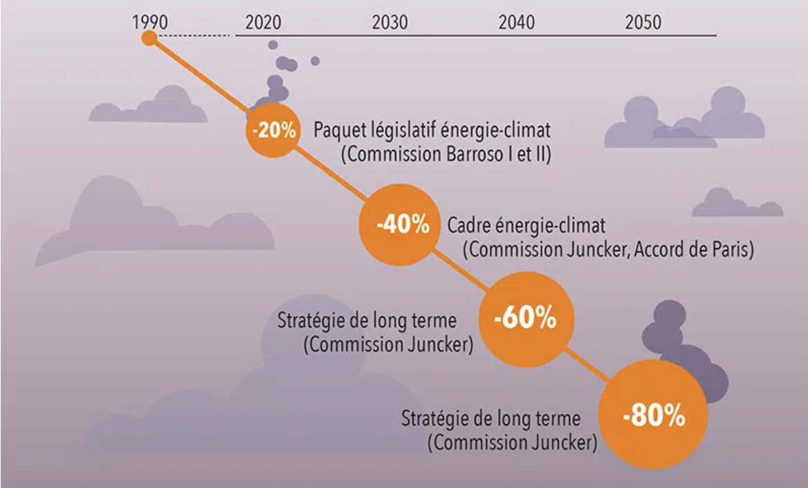 Objectifs de l’UE de réduction des gaz à effet de serre (1990 – 2050 – source : EdEn -énergies