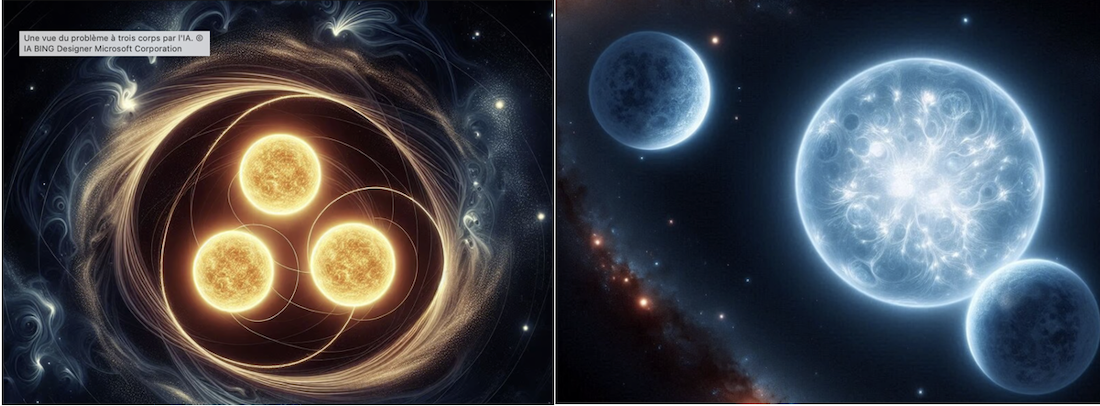 Transposition du problème à trois corps par l’IA et illustration réel d’un système TIC répertorié – source : IA BING Creator Designer Microsoft Corporation