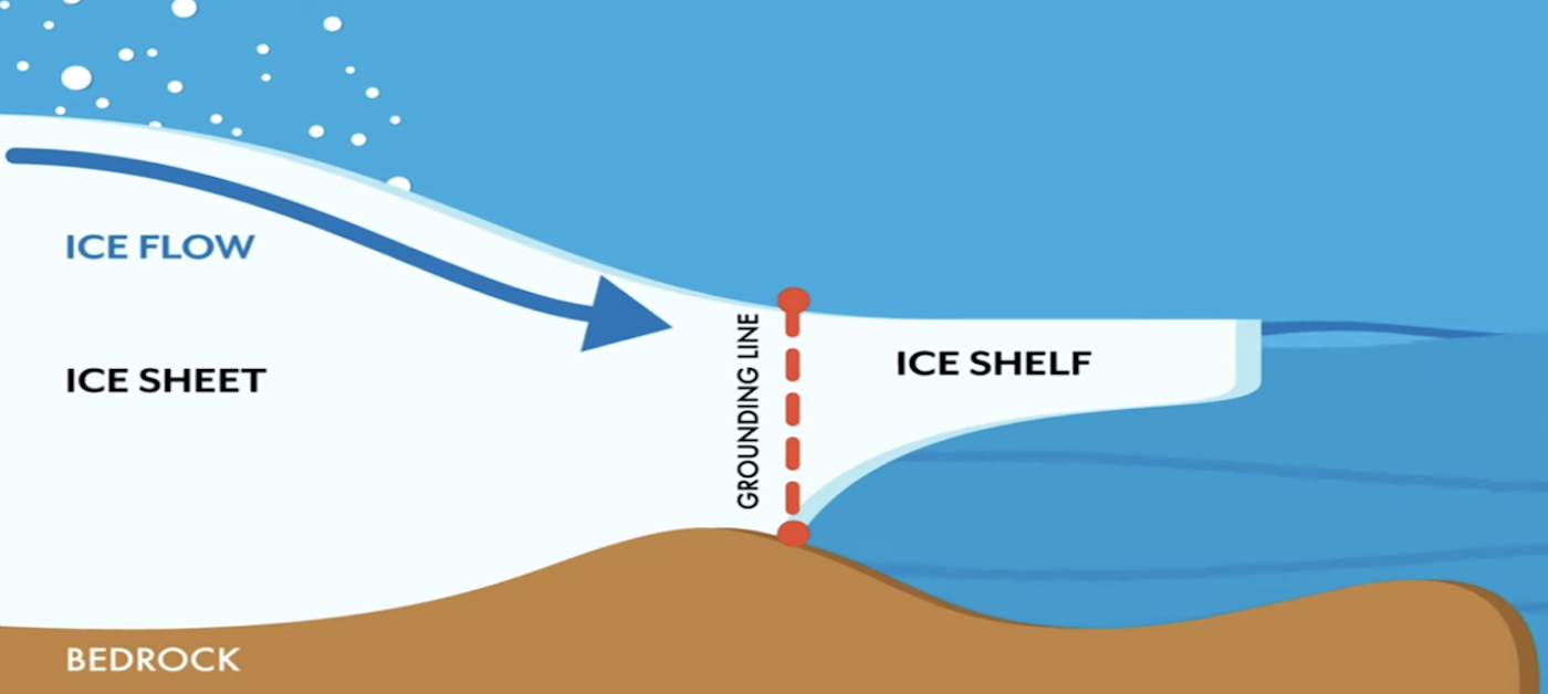 Schéma illustrant l’association classique entre un glacier (Ice sheet) et la plateforme flottante (ice shelf) qui l’accompagne et le prolonge dans l’océan. - source : Reporterre`