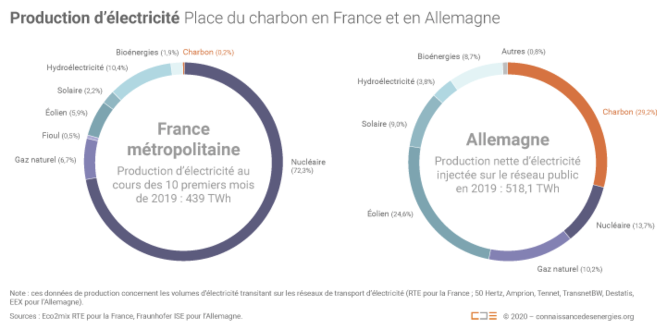 En effet, en France, la baisse de production d’électricité nucléaire qui n’émet que 6 gCO2/kWh (fermeture des deux réacteurs de Fessenheim et les retards dus au Covid) a dû être compensée par une baisse importante des exportations françaises (- 30%) et une forte augmentation des importations (+32%), notamment d’Allemagne dont le mix électrique est constitué de 45 % de combustibles fossiles (gaz et charbon) qui émet 400 gCO2/kWh (soit 10 fois plus qu’en France !).